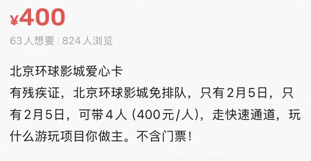因影城推出的「爱心通行服务卡」可领四人享受全项目免排队,于是部分持卡者以门市𱖧/4的价格进行兜售,之后通过陪同买家入园的方式,将自身的“特权”进行转移。